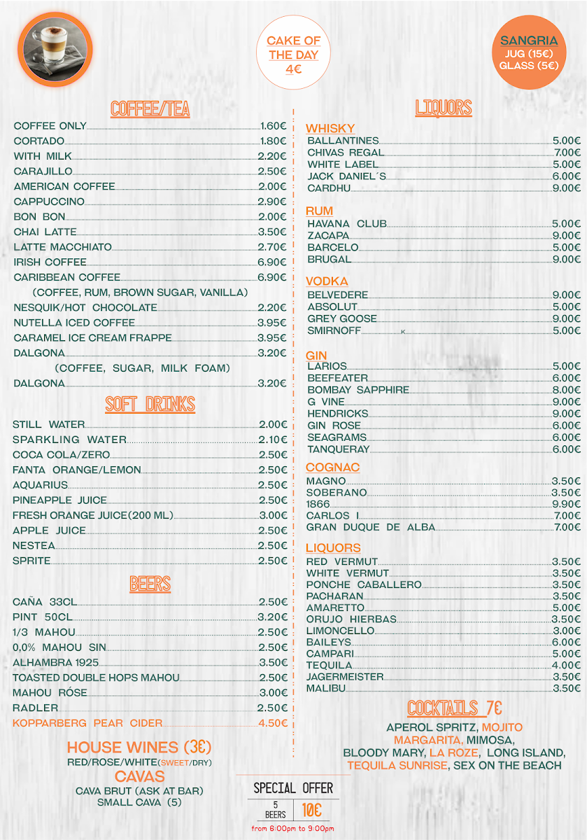 Breakfast choices include traditional items such as English Breakfast and several egg-based dishes like omelettes with various fillings, scrambled eggs on toast, and a range of toasts with different toppings including tomato, serrano ham, cheese, and tuna. These options are priced individually and cater to both simple and more substantial breakfast preferences.
