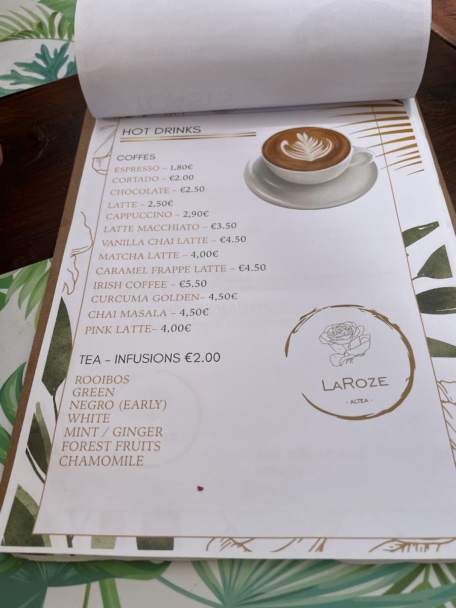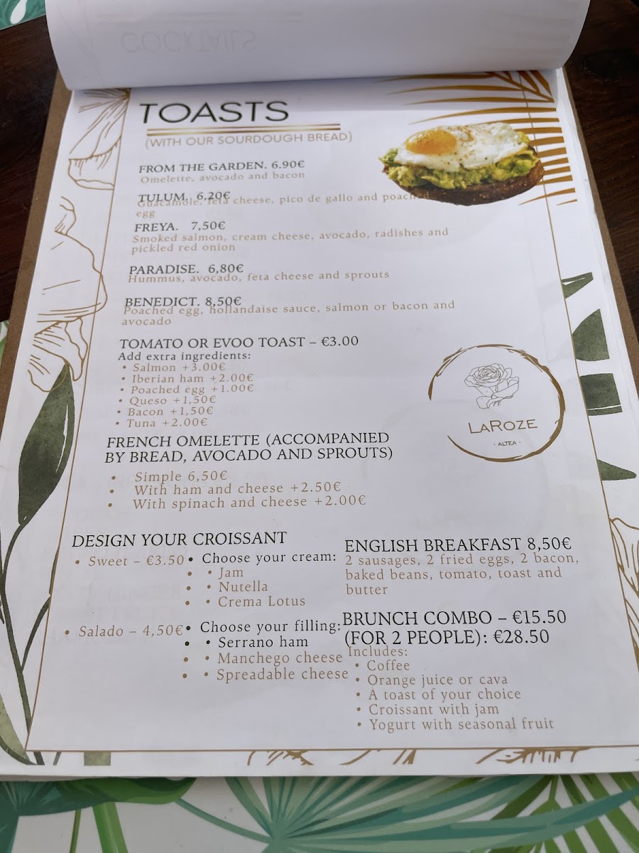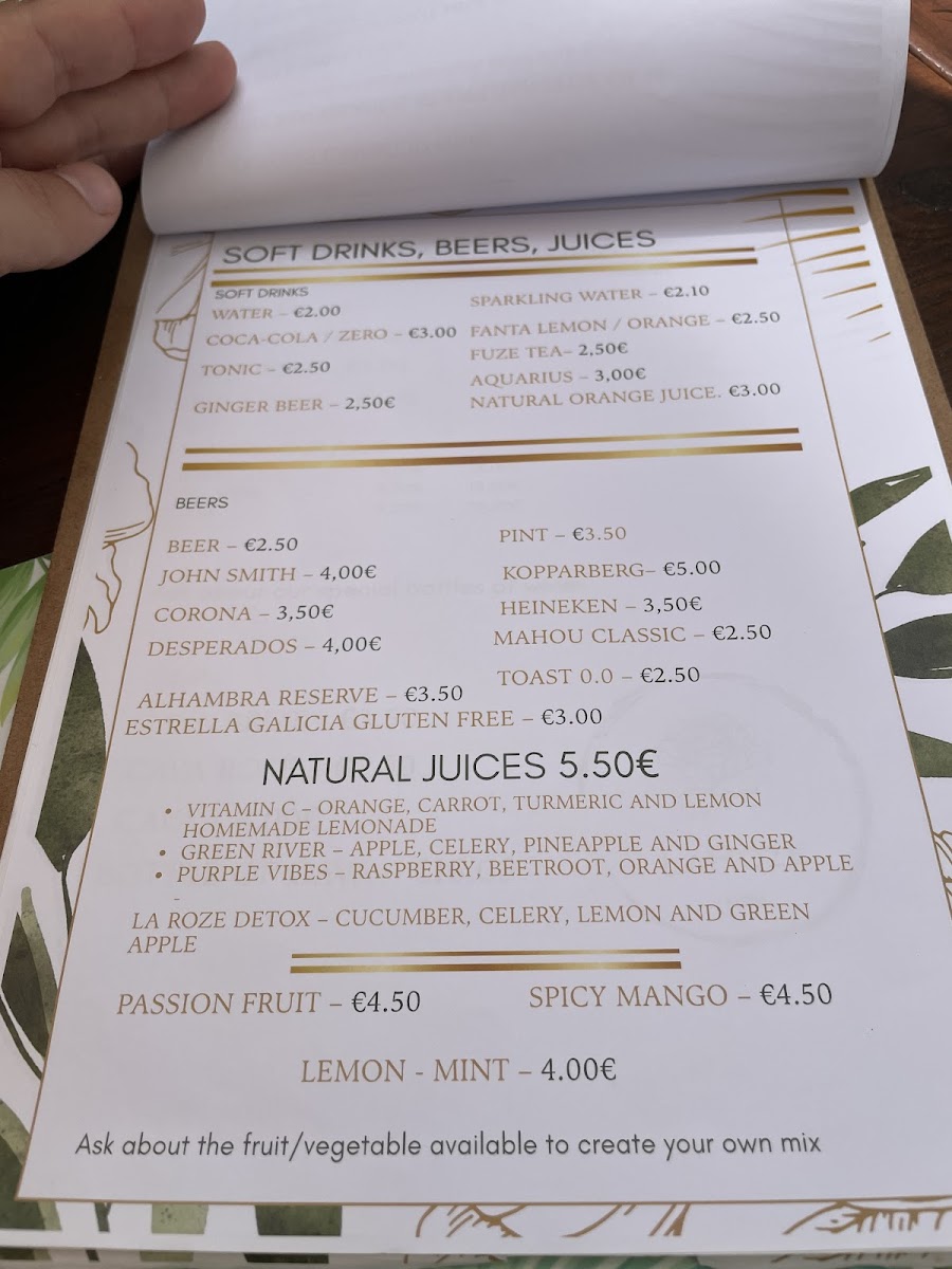 The menu at La Roze new concept offers a variety of options suitable for breakfast, light meals, and casual dining throughout the day. It is structured into clearly defined groups to facilitate easy selection.